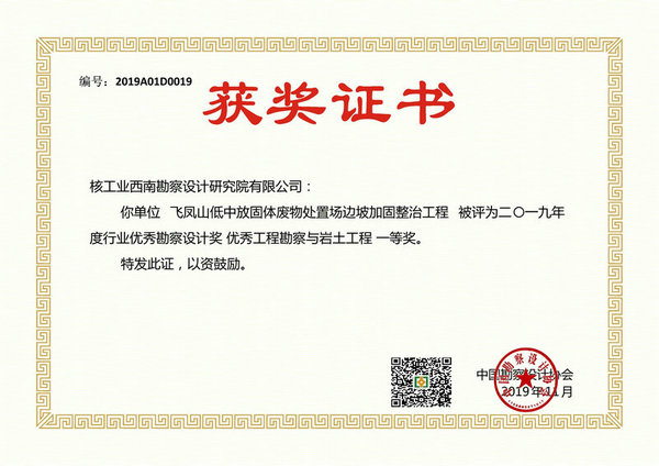 近日,中国勘察设计协会2019年度工程勘察、建筑设计行业和市政公用工程优秀勘察设计奖评选结果重磅揭晓!公司报送的两项成果荣获大奖,其中飞凤山低中放固体废物处置场边坡加固整治工程获得优秀工程勘察与岩土工程国家级一等奖,四川省绵阳片区茶园沟泥石流治理工程施工图设计获得优秀工程勘察与岩土工程三等奖!